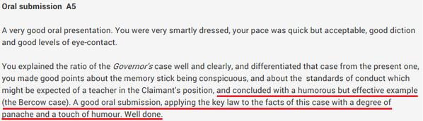 I finished my argument and thought I’d gone through it well. But then I could hear small titters behind me. This is not what I was expecting. But, I sat and listened to my opponent’s case. The marker made a comment (one many markers make after the oral assessments) that he had heard two interesting arguments – but (with some degree of irony) his facial expression suggested that he had found one more “interesting” that the other.